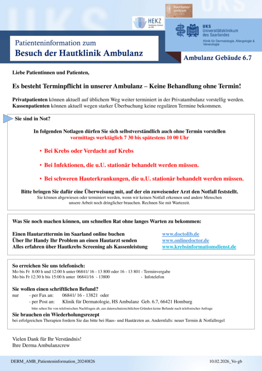 Patienteninformation zum Besuch der Hautklinik Ambulanz (Stand 2026)