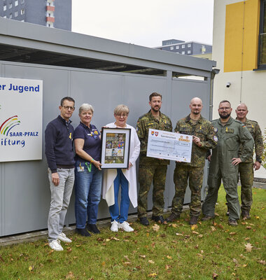 Es war ein ungewohntes Bild im Haus des Kindes und der Jugend: Uniformen in Flecktarn, olivfarbener Piloten-Anzug – die Bundeswehr war zu Besuch und hatte einen Spendenscheck über 13.500 Euro für die Elterninitiative krebskranker Kinder im Saarland e.V. im Gepäck.