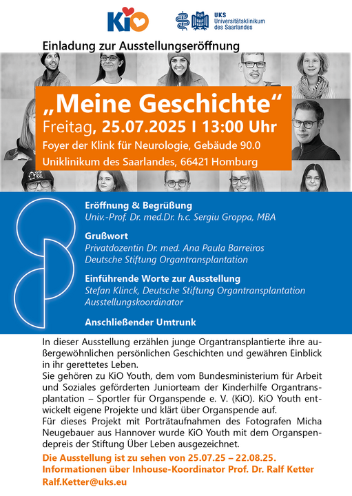 Am Freitag, 25. Juli 2025, wird um 13 Uhr die Wanderausstellung „Meine Geschichte“ am Universitätsklinikum des Saarlandes (UKS) in Homburg eröffnet. Auf großflächigen Informationsbannern erzählen 22 junge Organtransplantierte aus ihrem Leben. Die Ausstellung befindet sich ab der Eröffnung im Foyer des Neurozentrums (Geb. 90) und ist anschließend bis zum 22. August zu sehen.