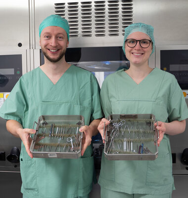Im engen Austausch mit den Operateurinnen und Operateuren, der Leitung des Zentralen Sterilgutmanagements am UKS Eva Lohse und der Sterilgut-Abteilung der Augenklinik wurde das Sieb neu zusammengestellt. „Wir konnten das Sieb letztendlich von zuvor 34 auf nun 18 Instrumente reduzieren, also den Umfang fast halbieren“, erklärt Dr. Alina Ritter. „Und das, ohne Einschränkungen beim operativen Notfallmanagement zu haben. Ganz im Gegenteil verbessert ein klar strukturiertes OP-Besteck sogar die Patientensicherheit, da es übersichtlicher ist und so die Fehleranfälligkeit bei der Instrumentierung weiter senkt“, betont Dr. Fabian Fries.