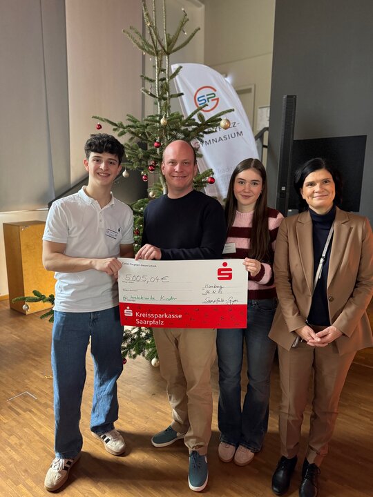 Am 3. September 2025 veranstaltete das Saarpfalz-Gymnasium Homburg einen Spendenlauf, bei dem die Hälfte der Spenden an Herzensprojekte der Schülerinnen und Schüler fließen sollte. Bei den Herzensprojekten der Schulgemeinschaft stand die Unterstützung krebskranker Kinder an erster Stelle. 5.450 gelaufene Kilometer brachten eine riesige Spendensumme zusammen, mit der niemand im Vorfeld gerechnet hatte. Stolze 5.005,04 Euro konnten am Tag der offenen Tür durch die Schülersprecher Sofia Knerr und Jannis Graff zusammen mit der Schulleiterin Katja Grauvogel an Prof. Dr. med. Marc Remke in der Aula des Saarpfalz-Gymnasiums unter großem Applaus der Schulgemeinschaft überreicht werden. Die Schulgemeinschaft des Saarpfalz-Gymnasiums hofft, mit dieser vorweihnachtlichen Spende möglichst vielen Kindern mit einer Krebserkrankung helfen zu können.