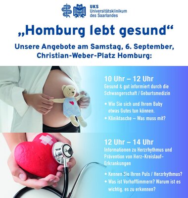 Das Universitätsklinikum des Saarlandes (UKS) beteiligt sich am Samstag, 6. September 2025, von 10 bis 16 Uhr auf dem Christian-Weber-Platz in Homburg am Aktionstag „Homburg lebt gesund“, der von der Stadt Homburg organisiert wird. Expertinnen des UKS informieren im Wechsel zu drei Schwerpunkten: Von 10 bis 12 Uhr „Gesund & gut Informiert durch die Schwangerschaft“, von 12 bis 14 Uhr „Herzrhythmus und Prävention von Herz-Kreislauf-Erkrankungen“ und von 14 bis 16 Uhr „Sonnenschutz und Hautkrebs“. Der städtisch organisierte Aktionstag ist Teil der landesweiten Initiative „Das Saarland lebt gesund“, die darauf abzielt, das Bewusstsein für Gesundheit und Prävention in der Bevölkerung zu stärken.