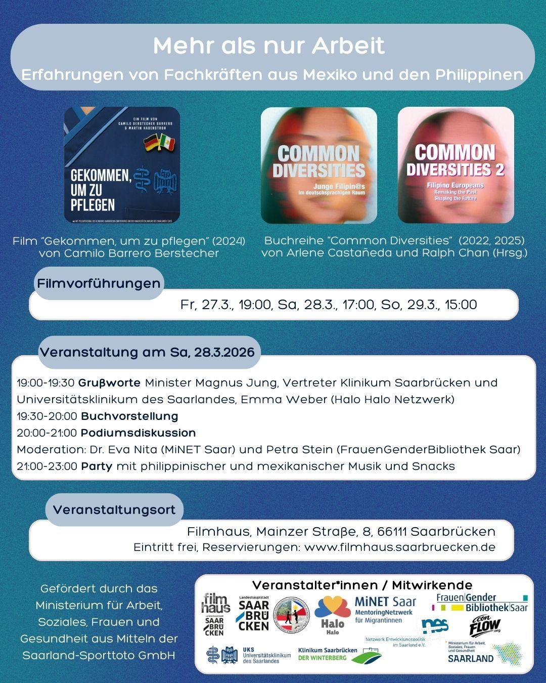 Am 28. März 2026 findet im Rahmen der Veranstaltung “Mehr als nur Arbeit” auch eine Filmvorführung des Filmes “Gekommen, um zu pflegen” statt. Neben der Filmvorführung ist auch eine Buchvorstellung „Common Diversities“ sowie eine Podiumsdiskussion geplant. An der Podiumsdiskussion nehmen mexikanische Fachkräfte vom Klinikum Saarbrücken und zwei philippinische Azubis vom UKS teil.